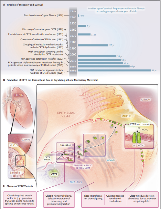 La fibrosis quística (FQ) es una enfermedad genética letal descrita inicialmente en 1938 por Dorothy Andersen, caracterizada por fibrosis pancreática, formación de quistes y bronquiectasias debido a secreciones espesas que obstruyen las vías respiratorias. Con el tiempo, se ha reconocido que la FQ es una exocrinopatía generalizada que afecta múltiples tejidos epiteliales. Si bien los tratamientos paliativos prolongaron la vida de los pacientes, el mecanismo patogénico permaneció desconocido durante décadas. En 1989, se identificó el gen "causal", CFTR, que codifica el regulador de la conductancia transmembrana de la fibrosis quística (CFTR), marcando un hito crucial.