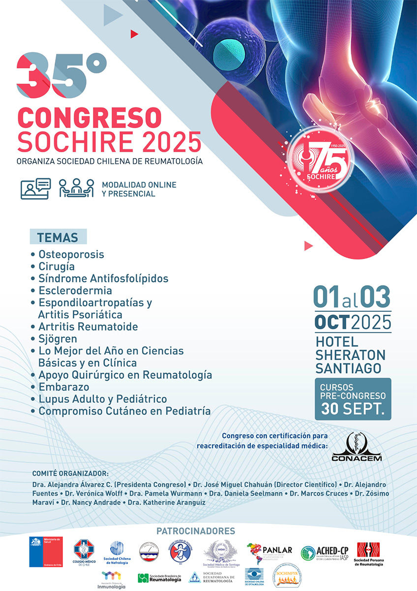 Este año el congreso tendrá un carácter muy especial, ya que se conmemoran 75 años de historia. Será una ocasión única para conmemorar la trayectoria, compartir avances científicos de alto nivel y proyectar el futuro de la reumatología en Chile.