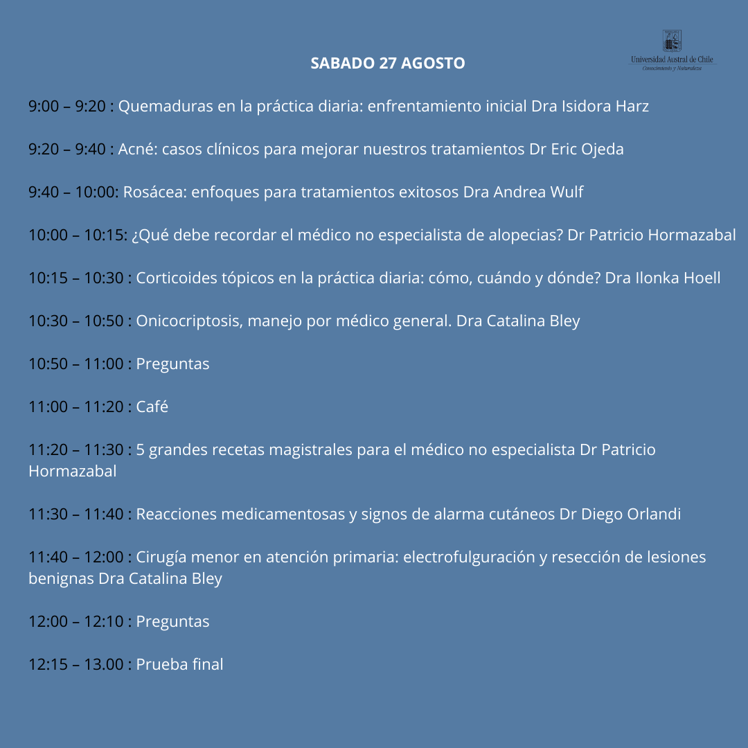 El programa se desarrollará en torno a cuatro ejes: "Acné, rosácea y cirugía menor", "Actualización en quemaduras", "Manejo de patología frecuente para médico no especialista" e "Infecciones de piel"
