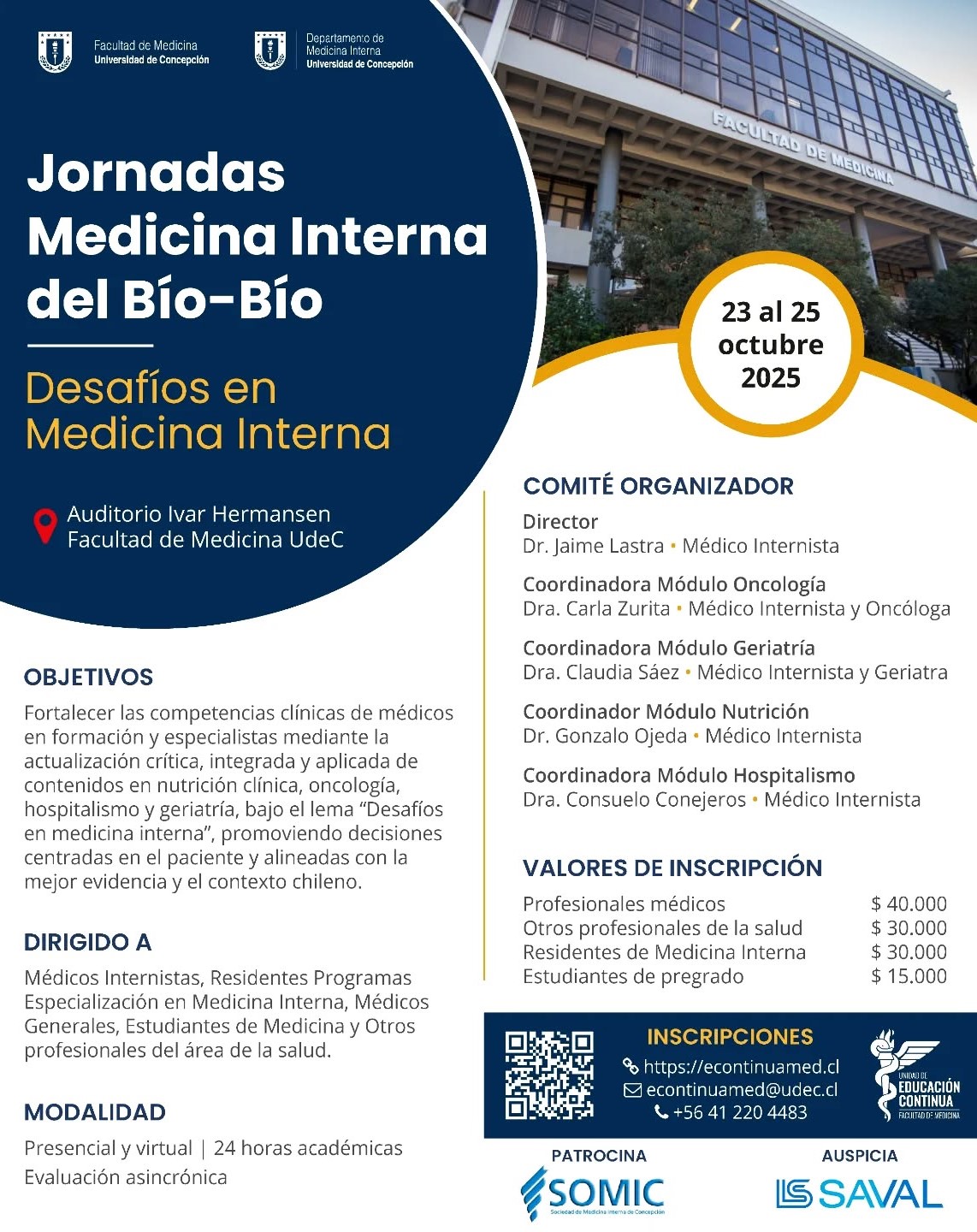 - Presencial: Auditorio Ivar Hermansen, Facultad de Medicina, Universidad de Concepción / Virtual: YouTube @postgradomedicinainternaudec